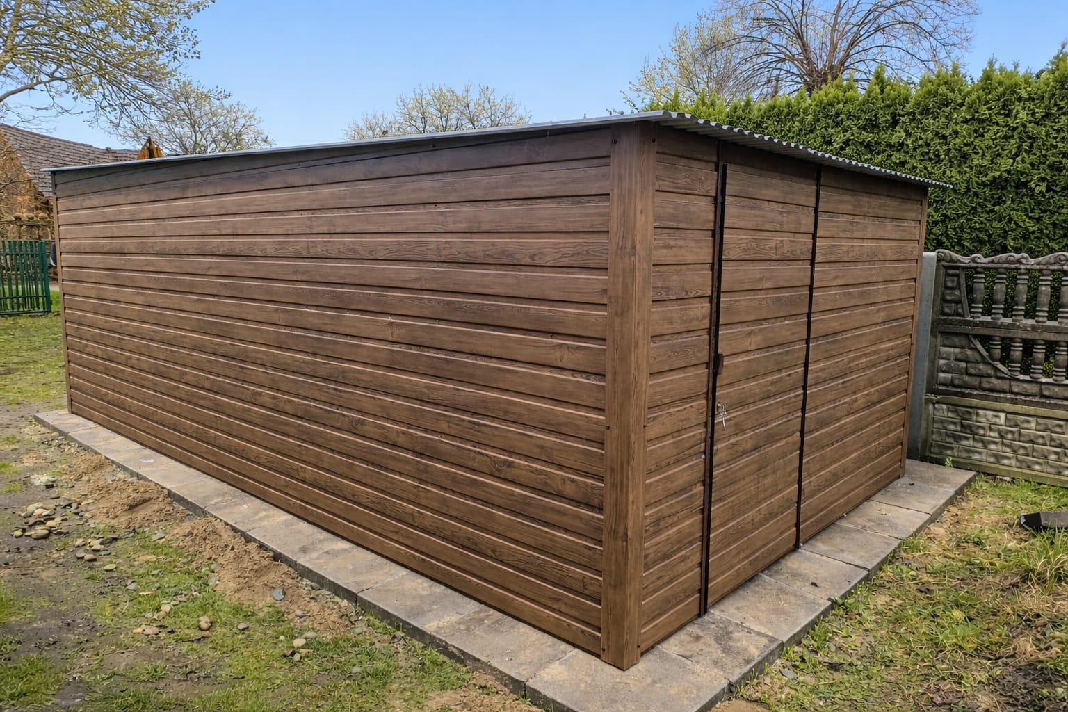 Garaż blaszany o wymiarach 3x5m z bramą podnoszoną do góry i spadem dachu na tył, pokryty blachą akrylową w kolorze Orzech z poziomym przetłoczeniem, drzwi na tylnej ścianie, obróbki blacharskie na rogach.
