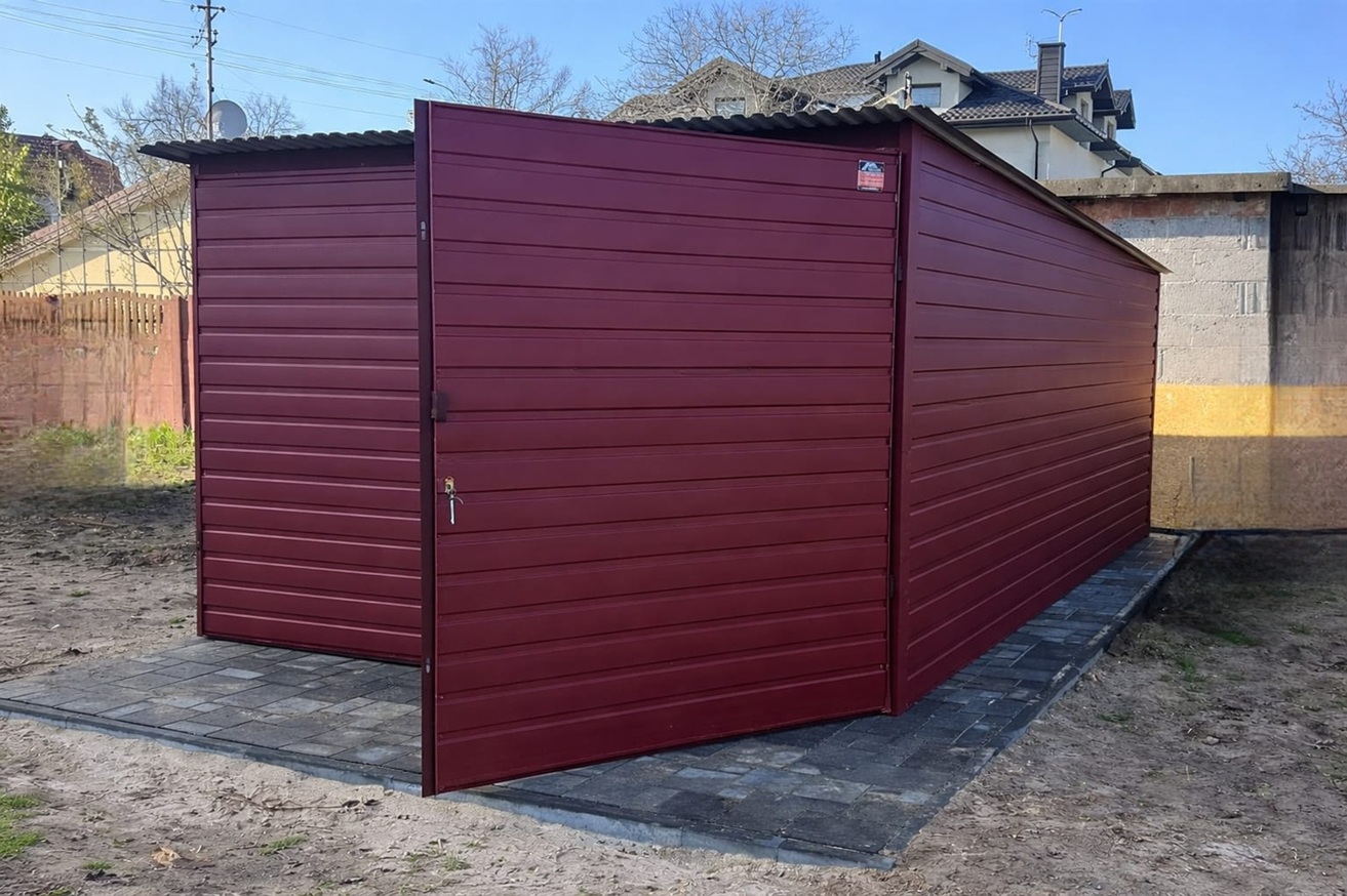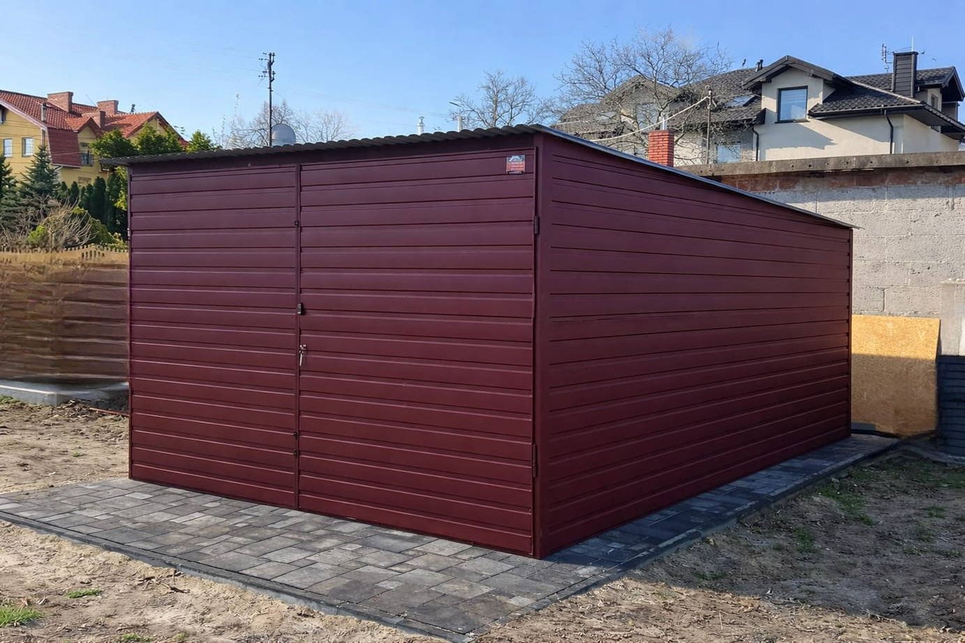 Garaż blaszany o wymiarach 3x5m z bramą dwuskrzydłową  i  spadem dachu na tył, pokryty blachą akrylową w wybranym kolorze MATOWYM z palety BTX z poziomym przetłoczeniem, obróbki blacharskie na rogach.