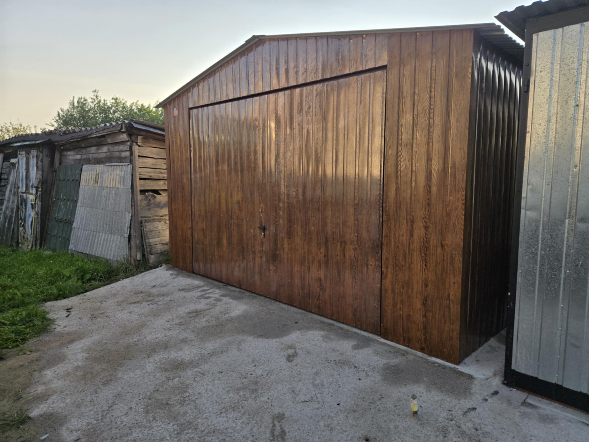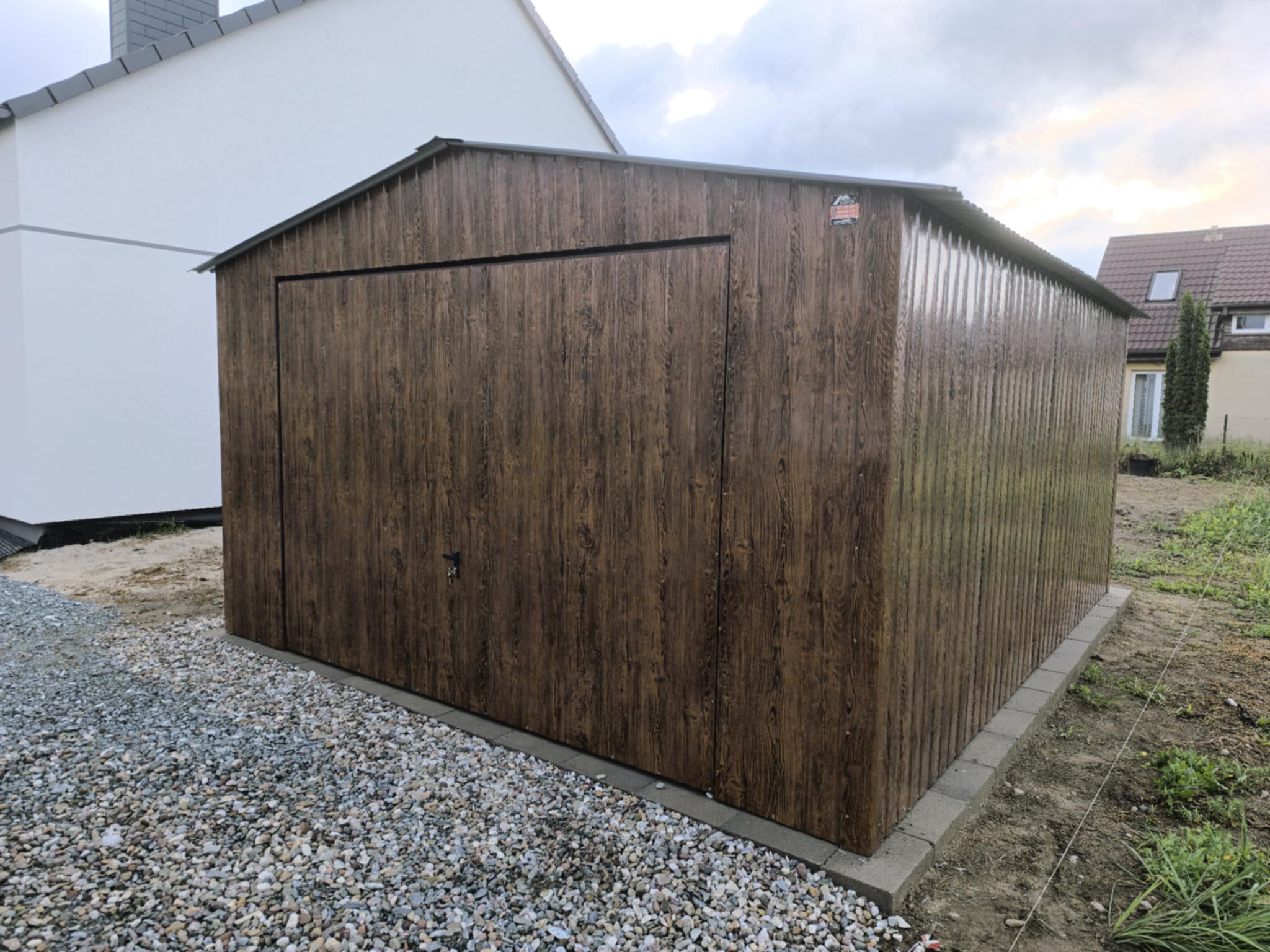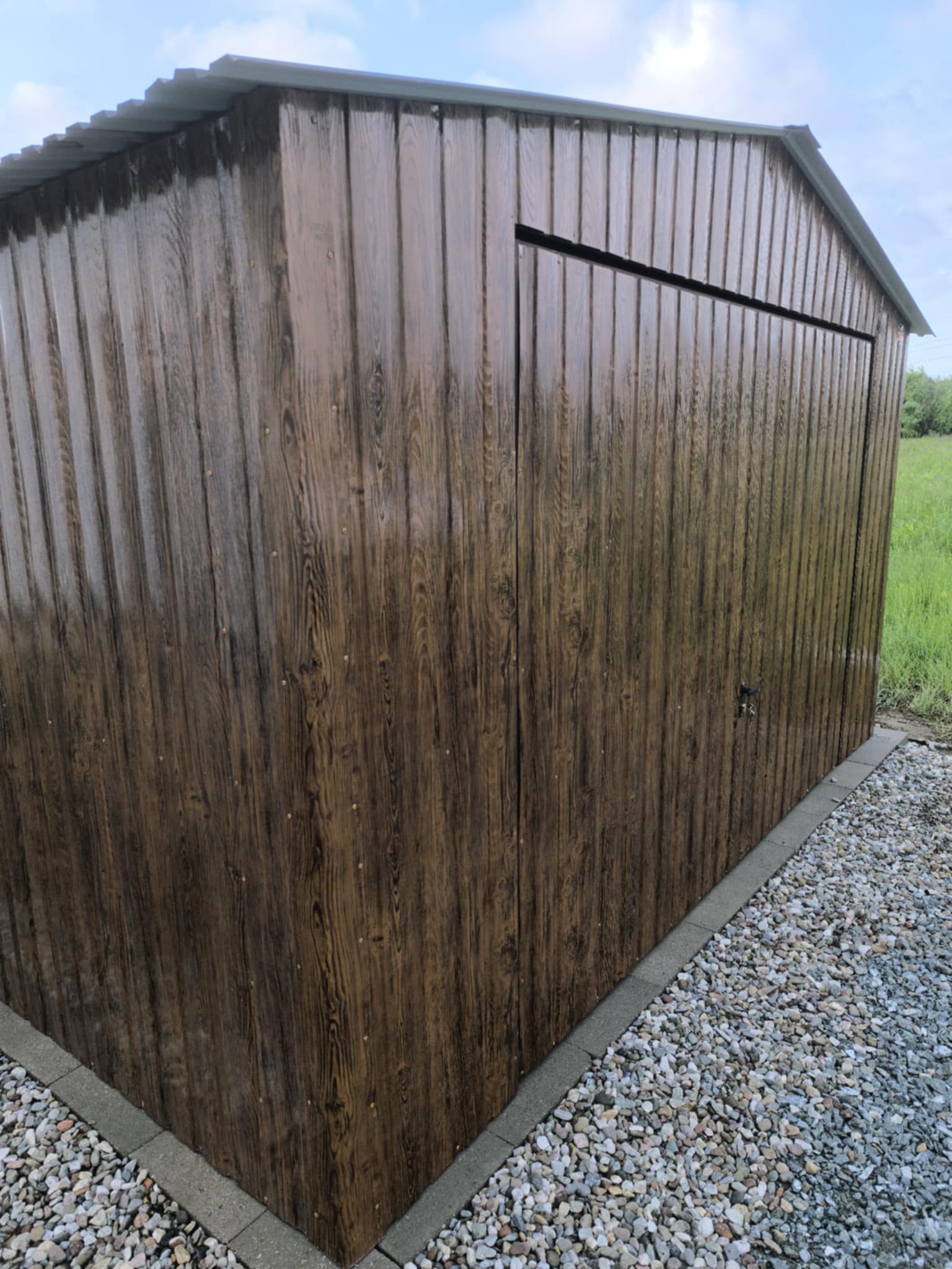 Garaż Blaszany standardowy o wymiarach 4x5m z bramą podnoszoną do góry i dwuspadowym dachem (blacha w kolorze RAL),  pokryty blachą akrylową drewnopodobną, nity w kolorze, obróbki blacharskie na rogach garażu