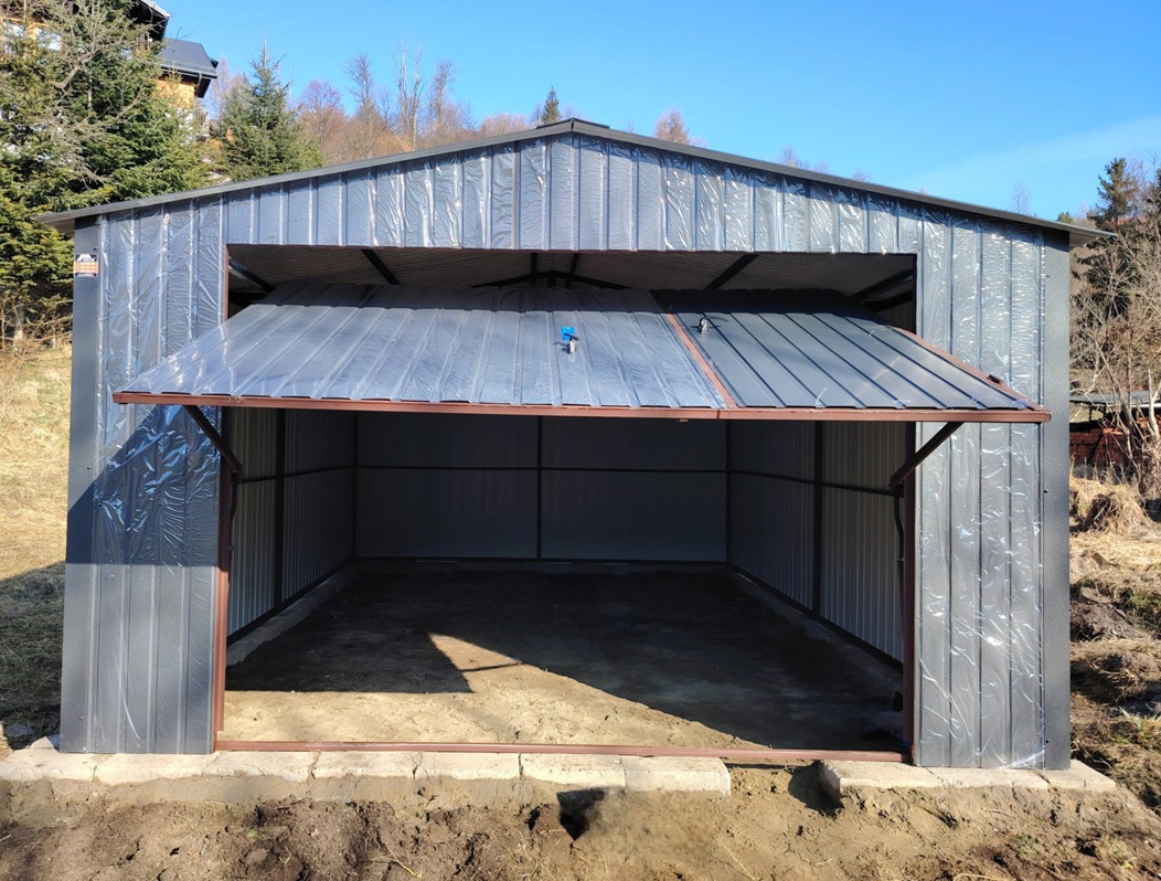 Garaż blaszany o wymiarach 4x5m z dwuspadowym dachem, bramą podnoszoną do góry, pokryty blachą akrylową w kolorze GRAFIT MAT, drzwiczki w bramie, obróbki na rogach.
