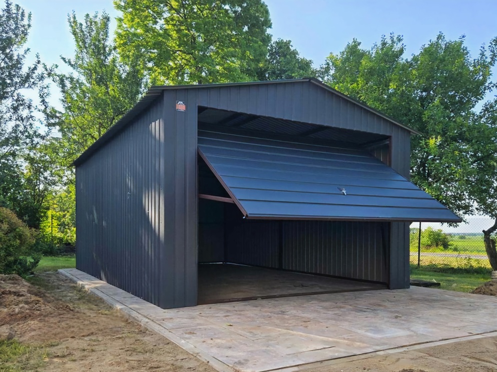 Garaż blaszany o wymiarach 4x6m z dwuspadowym dachem, bramą podnoszoną do góry (z poziomym przetłoczeniem blachy), pokryty blachą akrylową w kolorze GRAFIT MAT, obróbki na rogach.