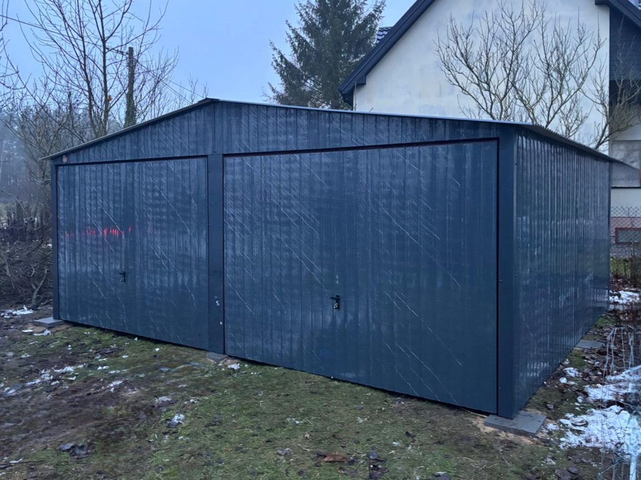 Garaż Blaszany standardowy o wymiarach 6x5m z dwoma bramami podnoszonymi do góry i dwuspadowym dachem, pokryty blachą w kolorze GRAFIT POŁYSK z obróbkami