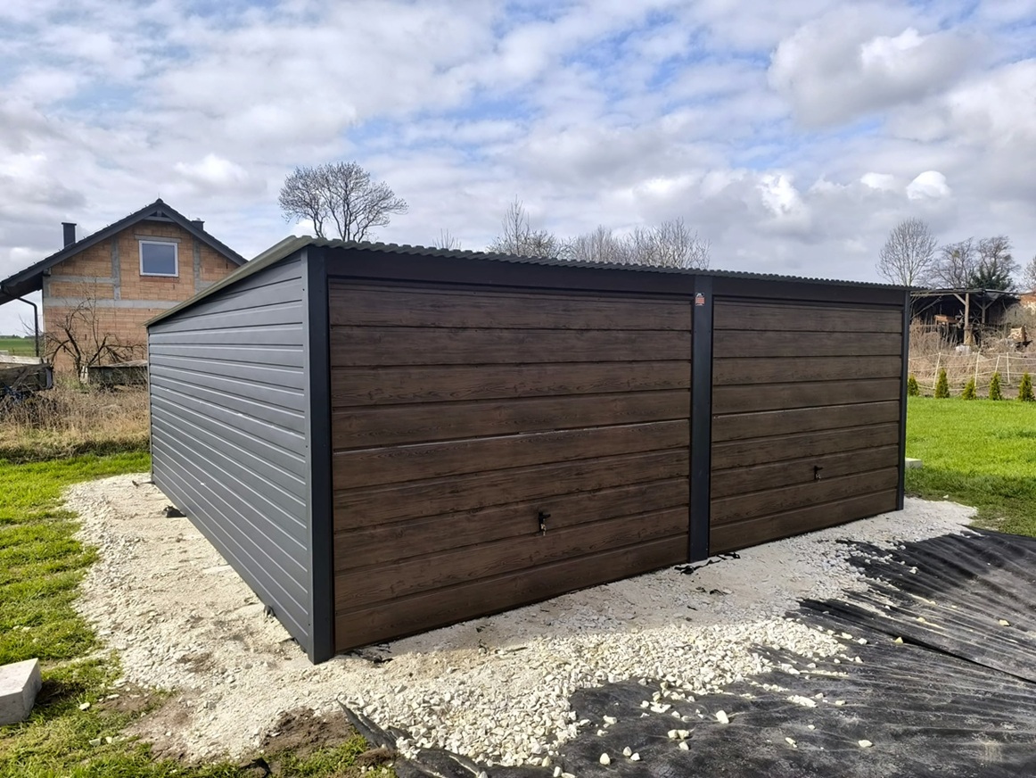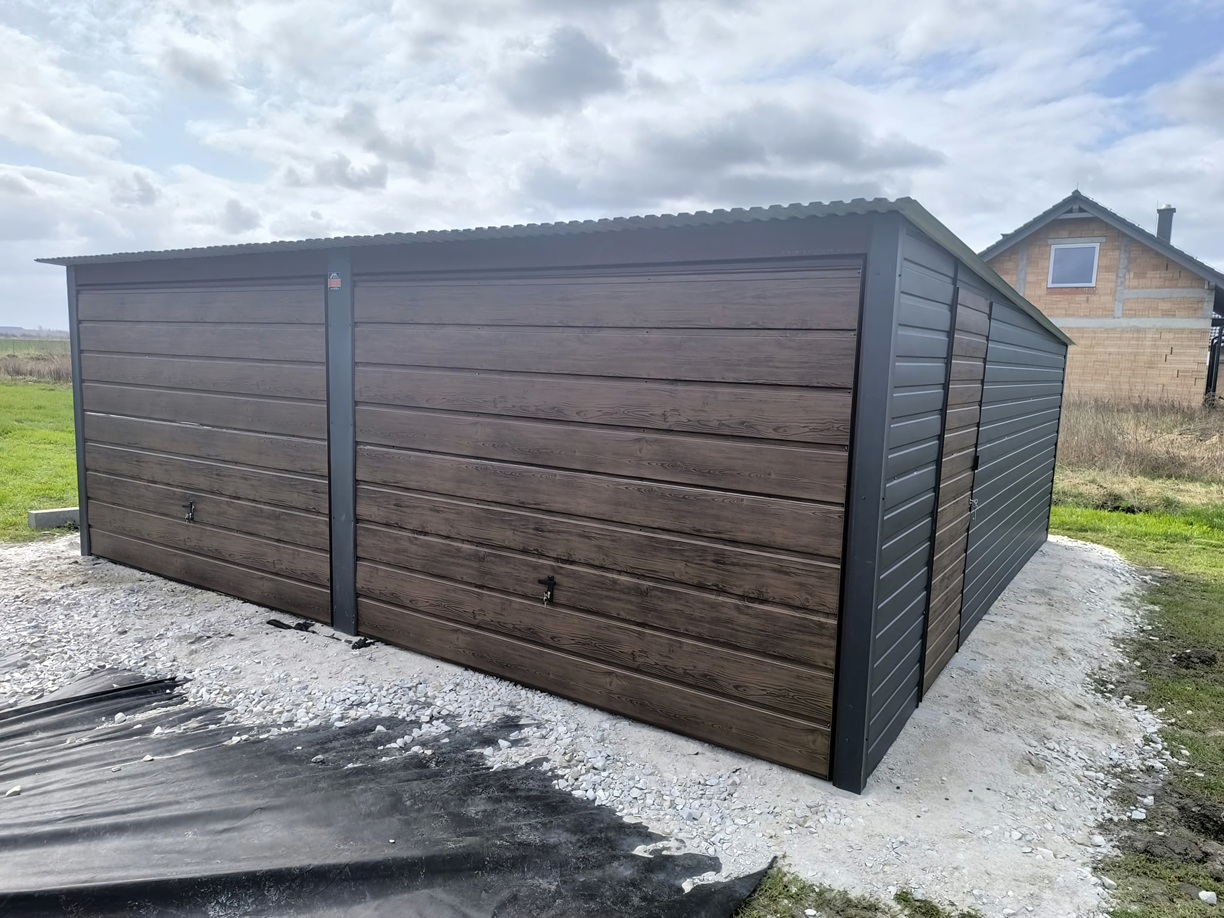 Garaż blaszany o wymiarach 6x6m ze spadem dachu na tył, wolna przestrzeń w środku, pokryty blachą akrylową w kolorze GRAFIT MAT BTX7016, z dwoma bramami podnoszonymi do góry w kolorze Orzech, drzwi boczne w kolorze Orzech, poziome przetłoczenie, obróbki blacharskie na rogach.
